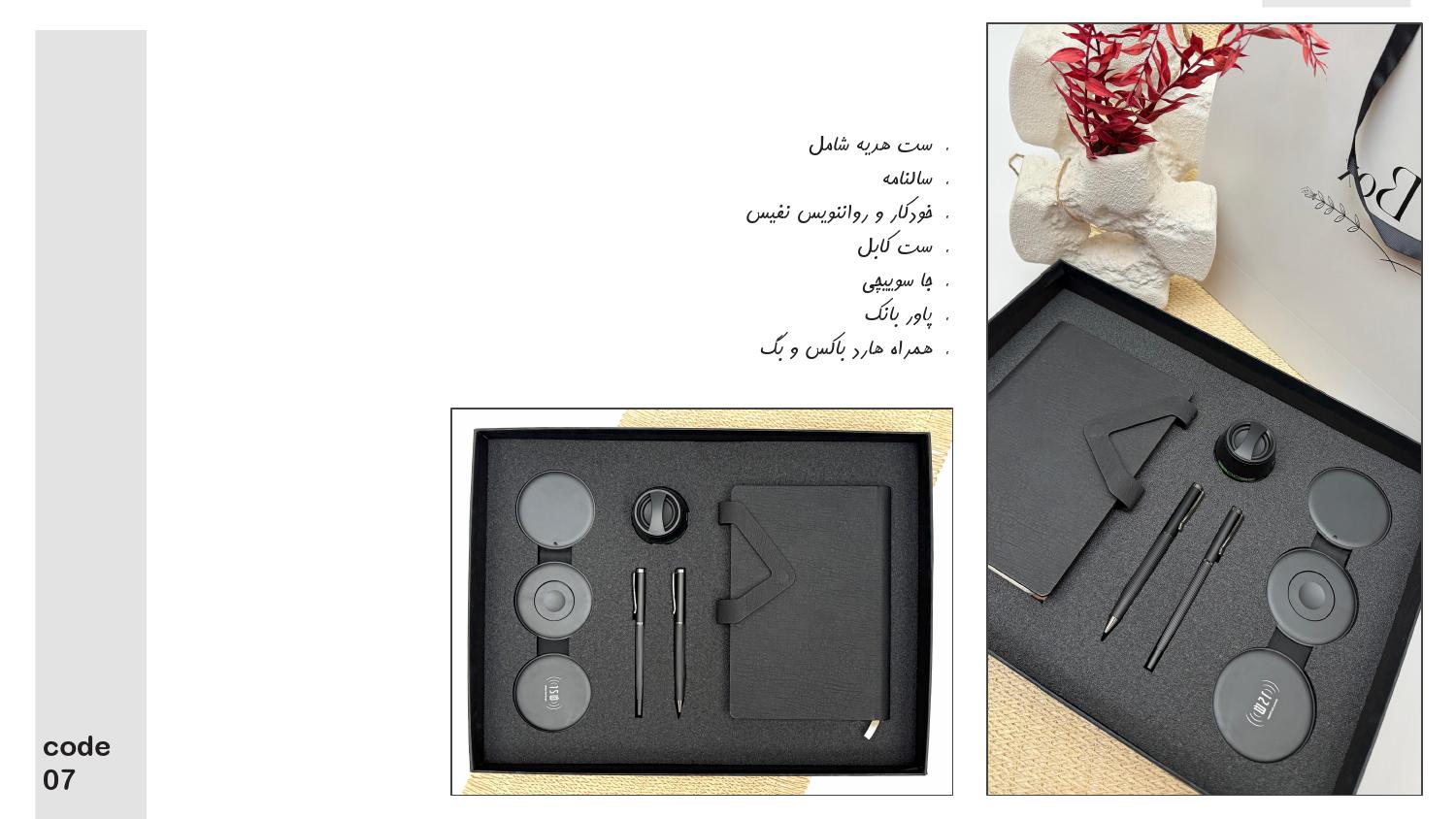 دارای سالنامه، خودکار و رواننویس نفیس، ست کابل، جاسوئیچی، پاوربانک