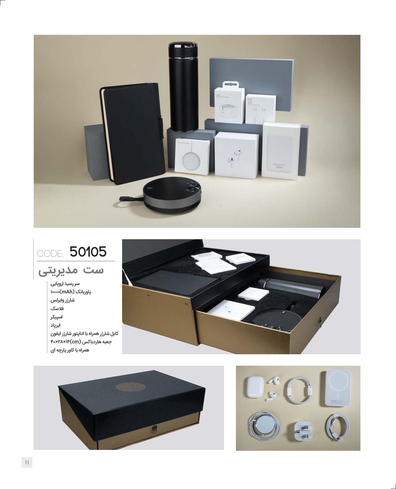سررسید اروپایی، ماساژور، ریش تراش، پاوربانک mAh10000، شارژر وایرلس، فلاسک، اسپیکر، ایرپاد، کابل شارژ همراه با آداپتور شارژر آیفون، به همراه کاور پارچهای