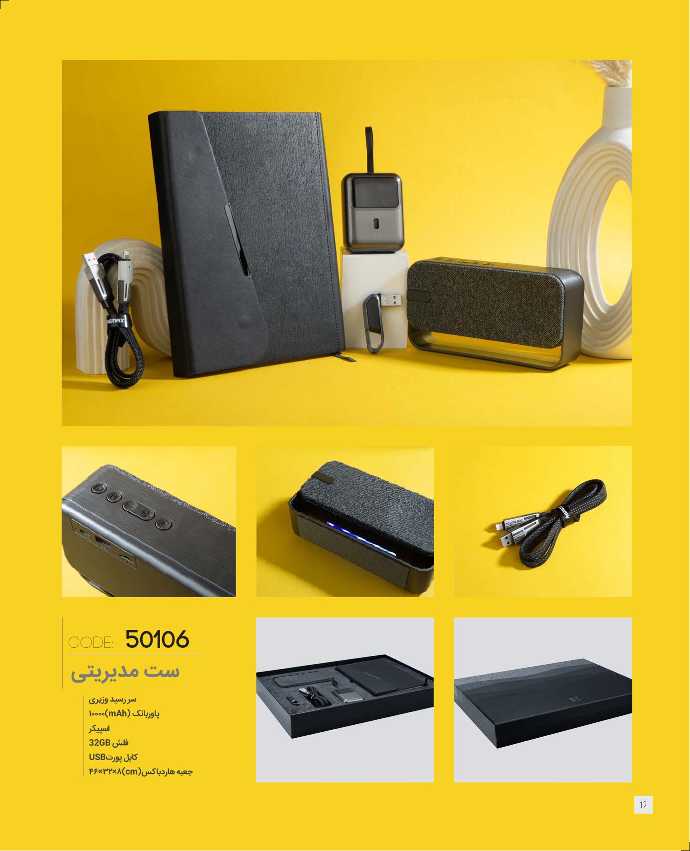 سررسید وزیری، پاوربانک mAh10000، اسپیکر، فلش 32GB، کابل پورت USB، به همراه کاور پارچهای