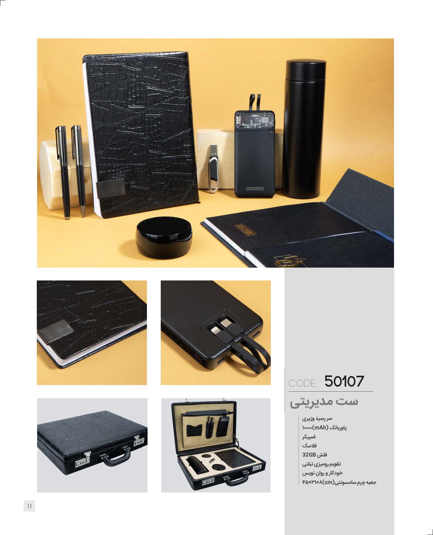 سررسید وزیری، پاوربانک mAh10000، اسپیکر، فلاسک، فلش 32GB، تقویم رومیزی تبلتی، خودکار و رواننویس، به همراه کاور پارچهای