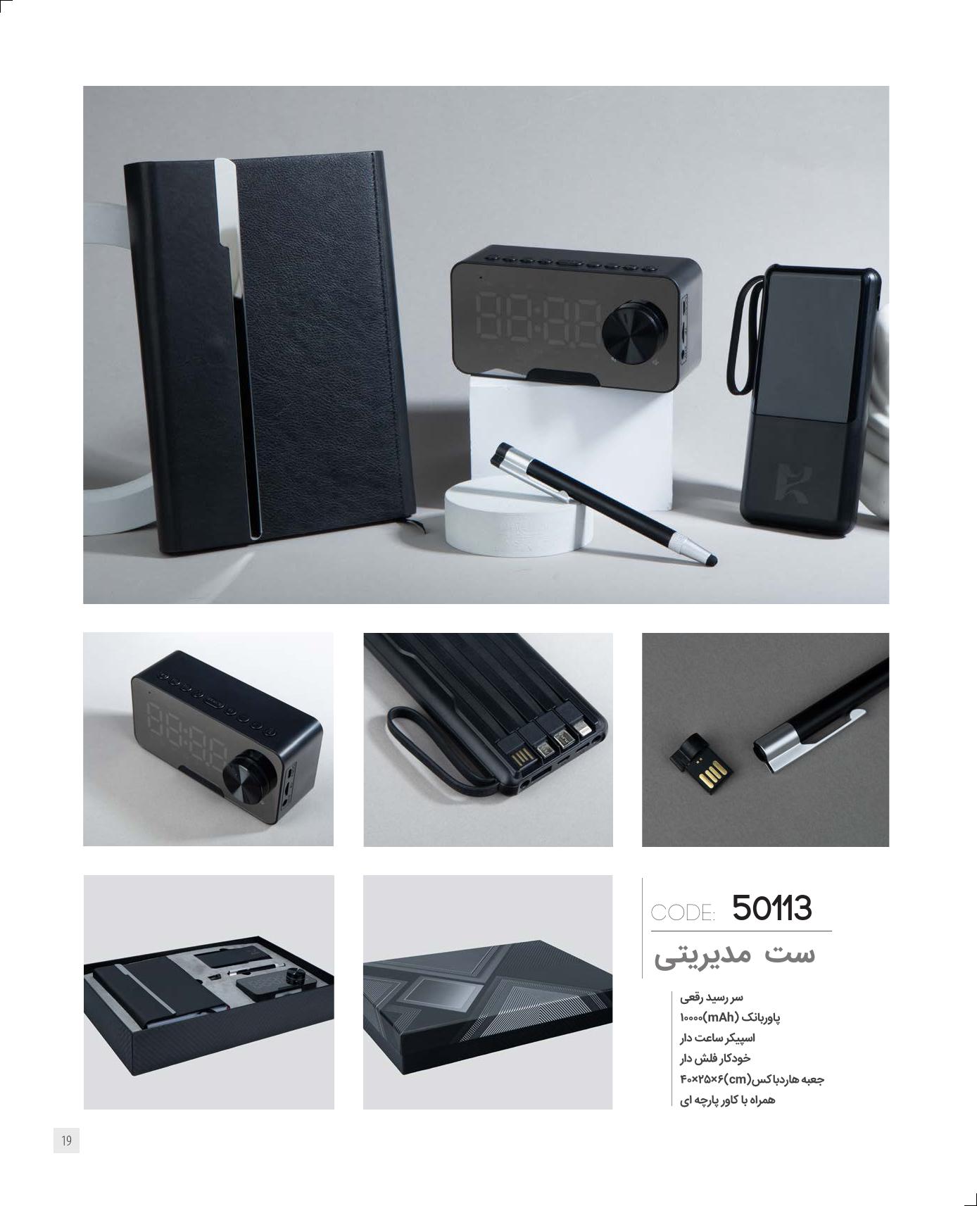 سررسید رقعی، پاوربانک mAh10000، اسپیکر ساعتدار، جاکارتی، خودکار فلشدار، به همراه کاور پارچهای