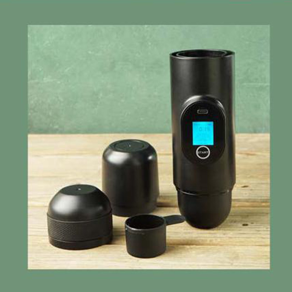 دستگاه اسپرسوساز شارژی، کاپ کاپوچینو، فنجان تک شات کاپ اسپرسو، قهوه مرغوب، 2عدد جعبه شکلات همراه شکلات، تخته سرو چوبی، یک بسته قهوه مرغوب، به همراه کاور پارچهای